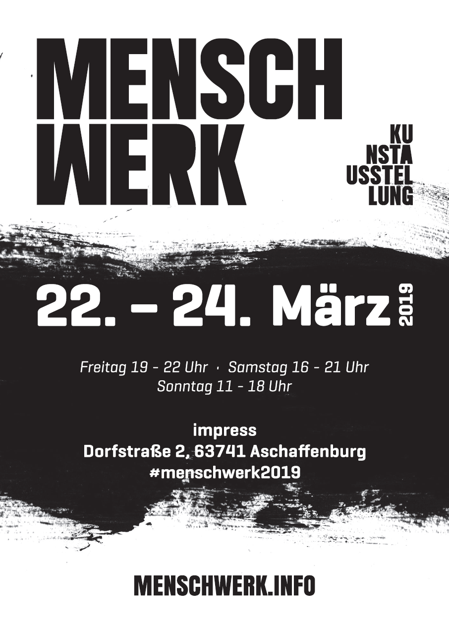 In Zusammenarbeit mit MENSCHWERK e.V. beleben wir für ein Wochenende unsere ehemaligen Produktionshallen wieder: Ab dem 22. – 24. März 2019 erwartet die Besucher ein außergewöhnliches Kunst-Erlebnis auf dem impress Firmengelände in Aschaffenburg.