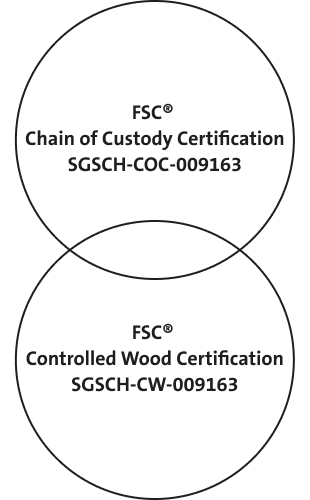 The FSC® certification ensures that materials originate from responsibly managed forests that provide environmental, social, and economic benefits. This standard aligns perfectly with our sustainability strategy and our contribution to global initiatives such as the UN Sustainable Development Goals and the UN Global Compact.